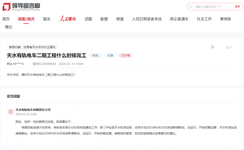 天水机场坐至埠南坐,有轨电车部门分阶段完成建...5月22日,有轨电车部门分阶段完成扶植工做:新三中坐至天水机场坐段,总体打算2025年6月30日完成联调联试、天水有轨电车无限义务公司答复网友天水有轨电车二期工程什么时候落成?按照目前进度打算放置,